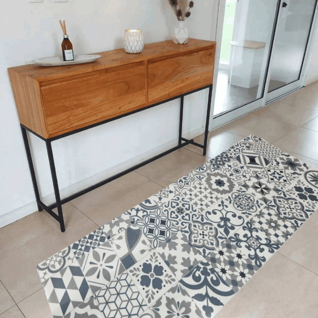 Fabricada en vinilo de alta calidad, esta alfombra no solo es estéticamente atractiva, sino también práctica y fácil de mantener. Su material resistente permite un uso diario sin preocuparse por el desgaste, ideal para áreas de alto tráfico. Además, su superficie fácil de limpiar asegura que siempre luzca impecable, haciendo de esta alfombra una opción funcional y duradera.