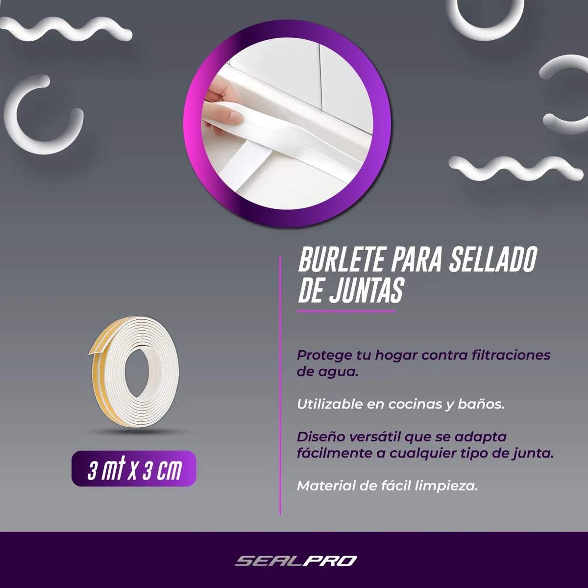 Contenido: 1 burlete de 3 mts autoadhesivo para sellado de juntas en cocinas y baños. CARACTERÍSTICAS