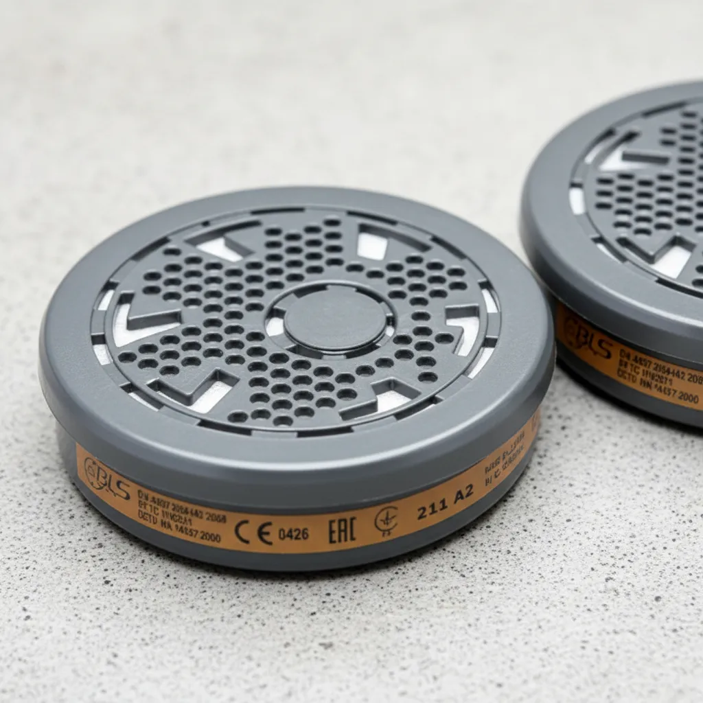 Kit de cartuchos 211 A2 para gases y vapores organicos (clase 2) CARBÓN ACTIVADO: La calidad de los carbones activados utilizados por BLS para la filtración de gases y vapores, cumple los más altos estándares de seguridad, lo que garantiza un excelente rendimiento y durabilidad de filtración. Producidos sin aditivos tóxicos, tales como; cromo hexavalente (Cr VI) y están certificados de calidad alimentaria (REGVE231/2017).