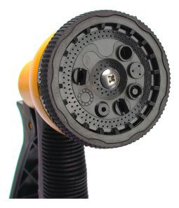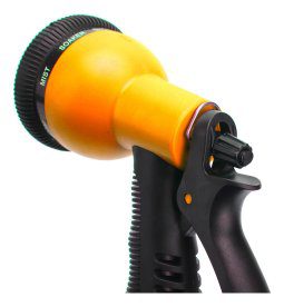 Pistola de riego con 8 funciones: plano, chorro, jet, vertical, tipo cono, niebla, ducha, riego y centrado.