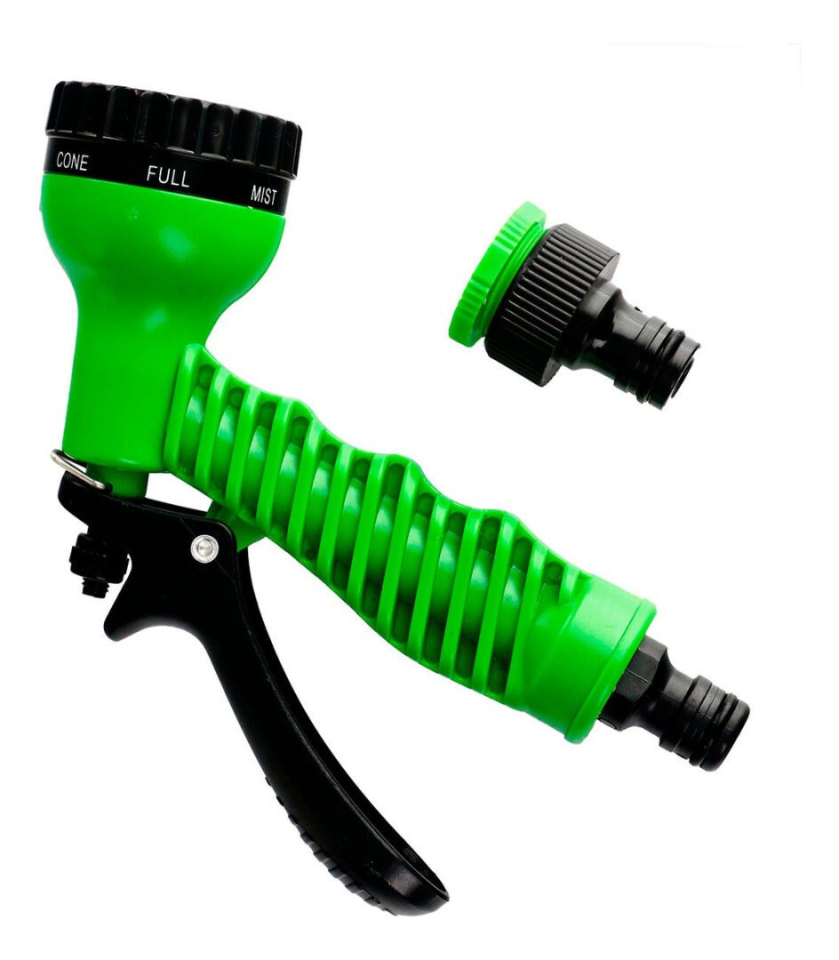 Conector a rosca y pistola con 7 funciones de salida: niebla, completo, tipo cono, centrado, plano, ducha y jet