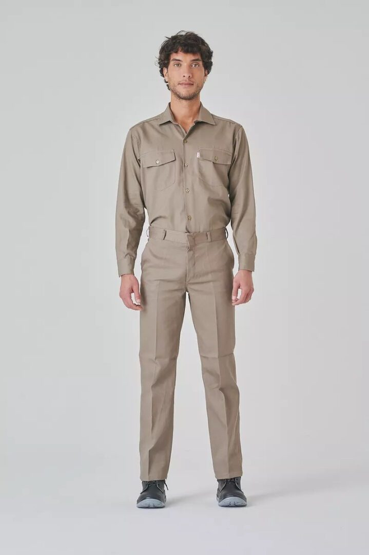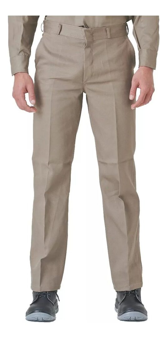 Interiores de bolsillos en tela lienzo. Cintura con pasacinto, brageta con botónes y ojales. Triple costura cadena en unión del lado externo e interior de la pierna.